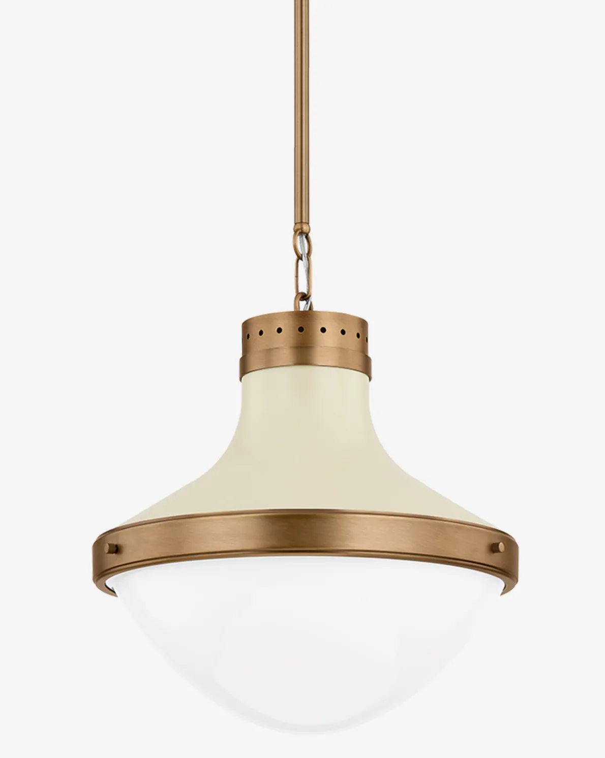 In a unique shape, the Maxton Pendant brightens up your space. Its opal glossy glass allows for a soft, diffused light, while the patina brass hardware adds elegant detail to the fixture.