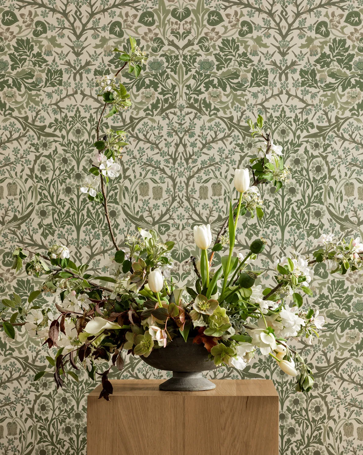 The Blackthorn Wallpaper is a signature and historic Morris & Co. pattern reimagined in a new color palette, created exclusively for McGee & Co. in collaboration with Shea McGee. The intricate motif is lively with sage and neutral hues, enhancing every detail of the space it occupies.