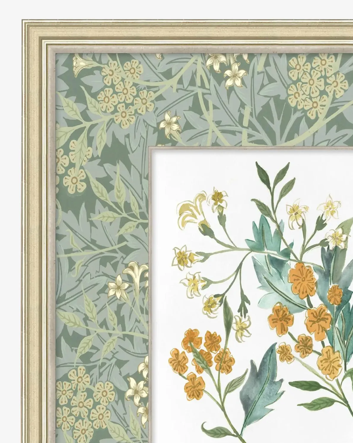 Color and pattern take center stage in Morris Icon II. Presented as a giclee print on matte paper with a printed top mat in a sliver-leaf finish frame, the traditional piece brings gallery quality materials to your home.