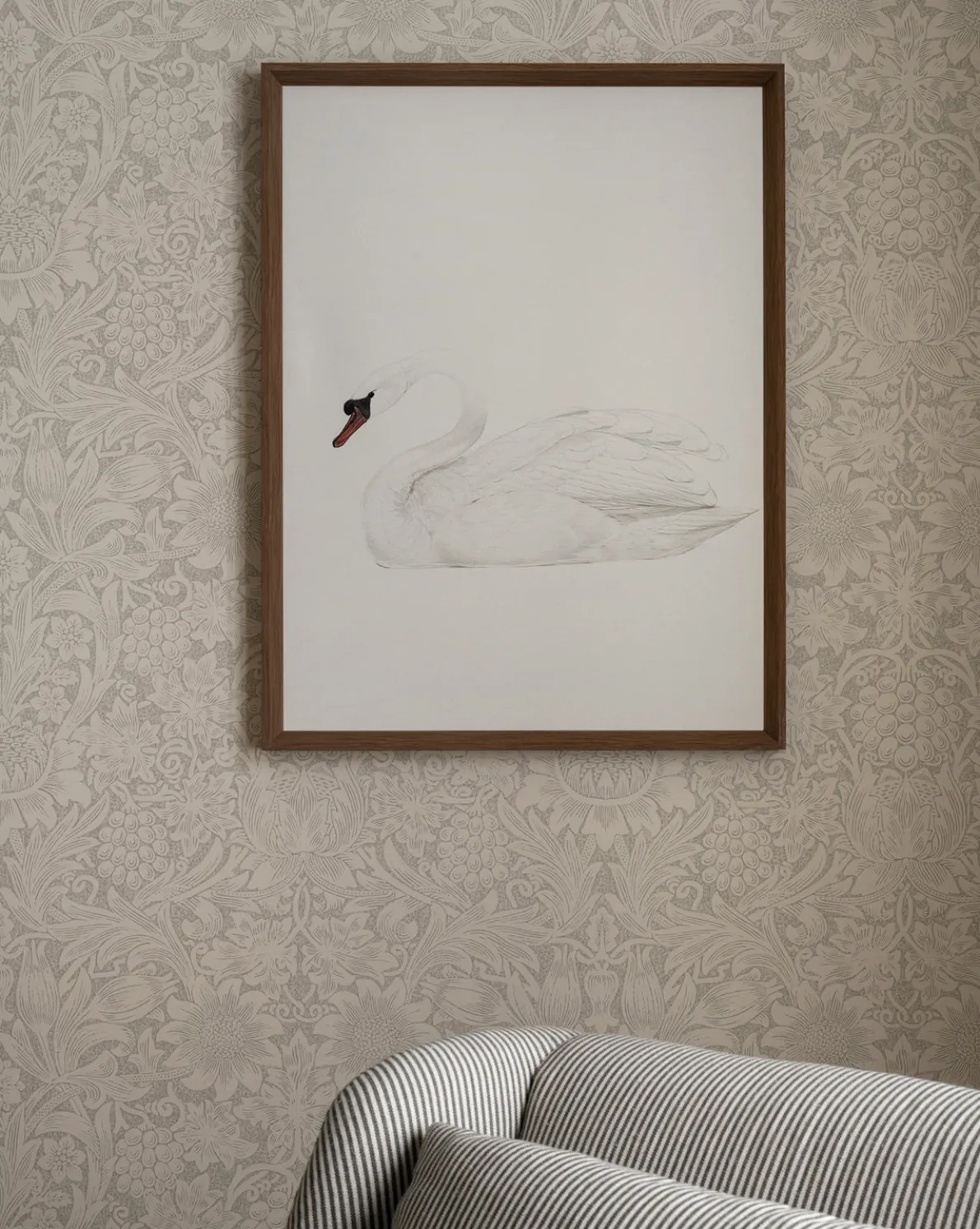 Mounted in a walnut wood grain frame, Neutral Swan is a giclee print on gallery-wrapped canvas. The detailed swan displays masterful technique in a calming composition and palette, bringing a beautiful and charming detail to the room.