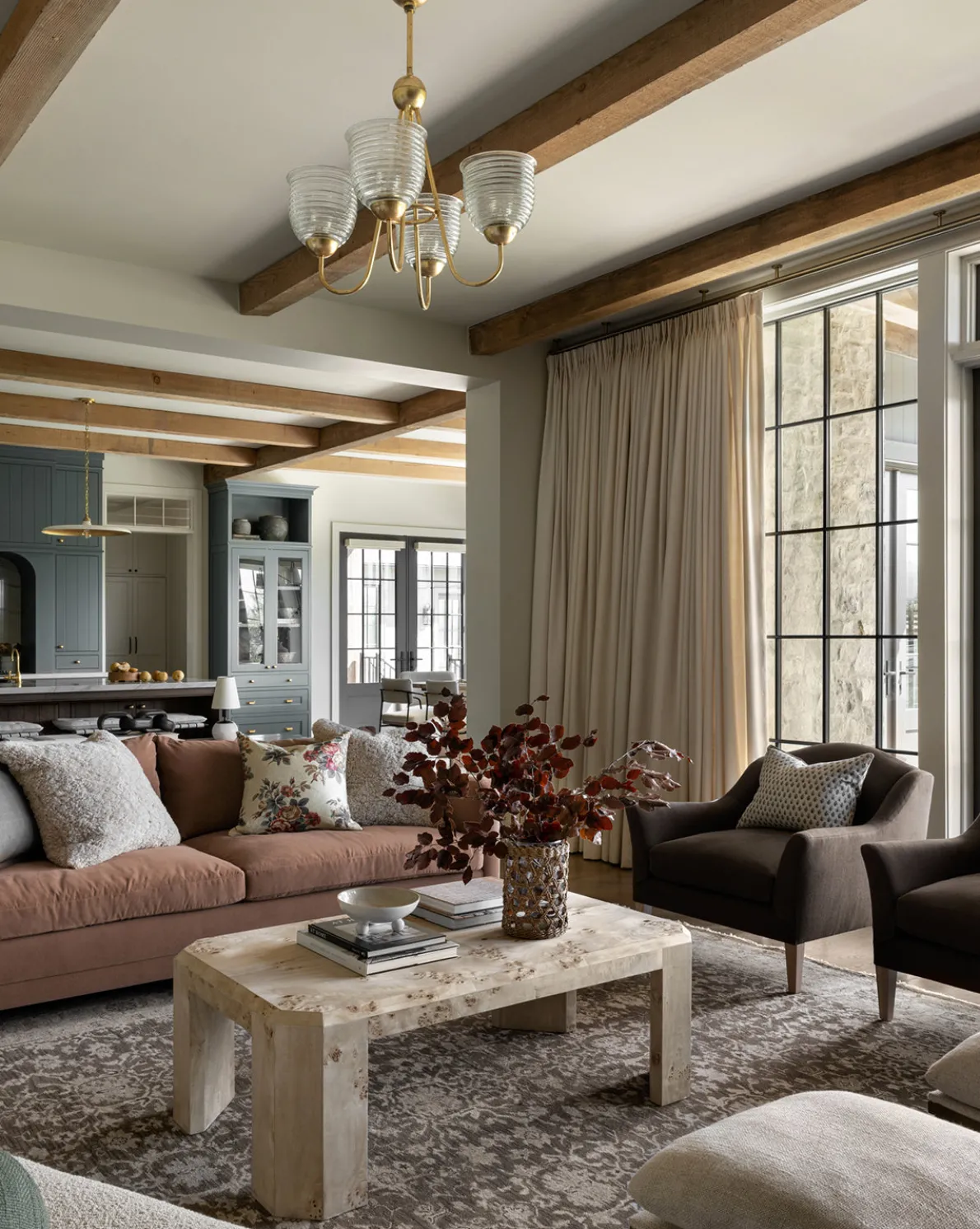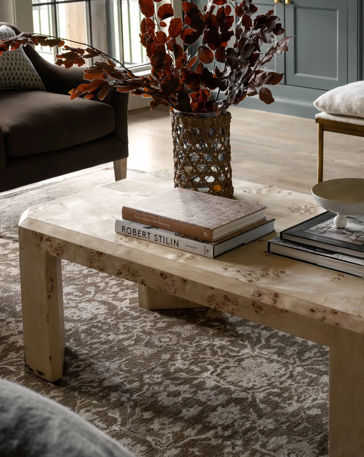 With organic detail and geometric construction, our Rocio Burl Coffee Table elegantly pairs modern style with natural materials. The wide coffee table is made from burl wood with a natural finish, highlighting the unique features and contrasting tones of the wood grain and displaying the table’s vintage-inspired design.